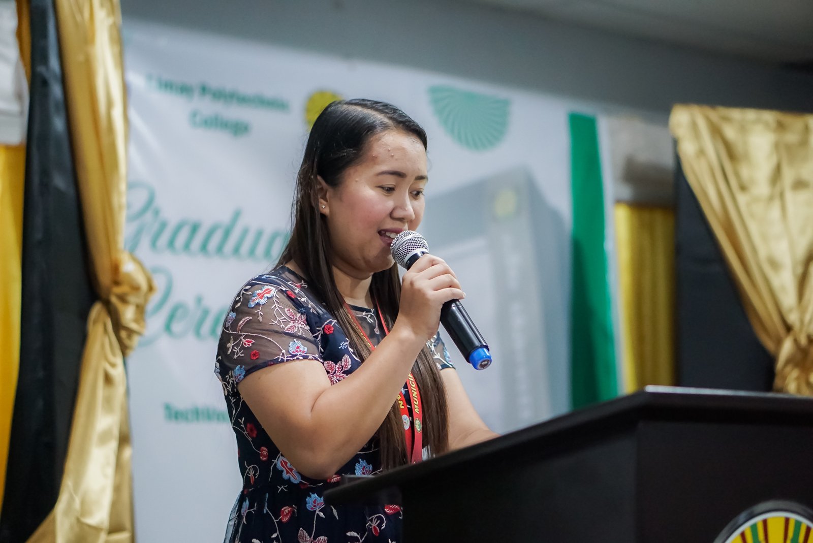 Dr. Elmer de Leon, college president, delivered opening and welcome address and confirmation of batch completers upon presentation of Ms. Maritez Pacquing, registrar; Mr. Melchor Fernando, municipal administrator, on behalf of Hon. Mayor Richie Jason David read the latter's inspirational message for the completers; Hon. Remigio Tayag, Jr., Sangguniang Bayan Education Committee chair also gave his congratulatory message; and Ms. Rodalie Dineros, head of DTVMLLE had her closing and acknowledgment remarks.