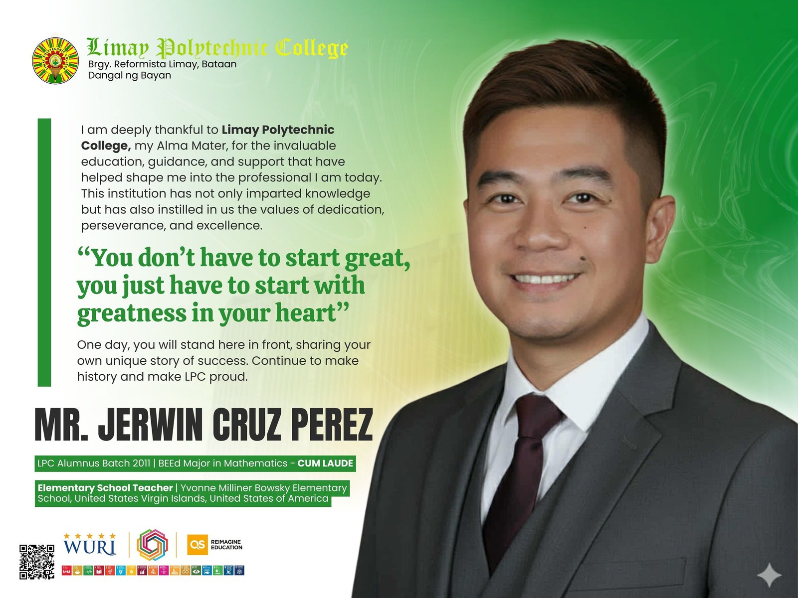 From the quiet town of Limay, Bataan to the classrooms of the United States Virgin Islands, Jerwin Cruz Perez stands as a living testament to what passion for education and a strong foundation from Limay Polytechnic College can achieve.