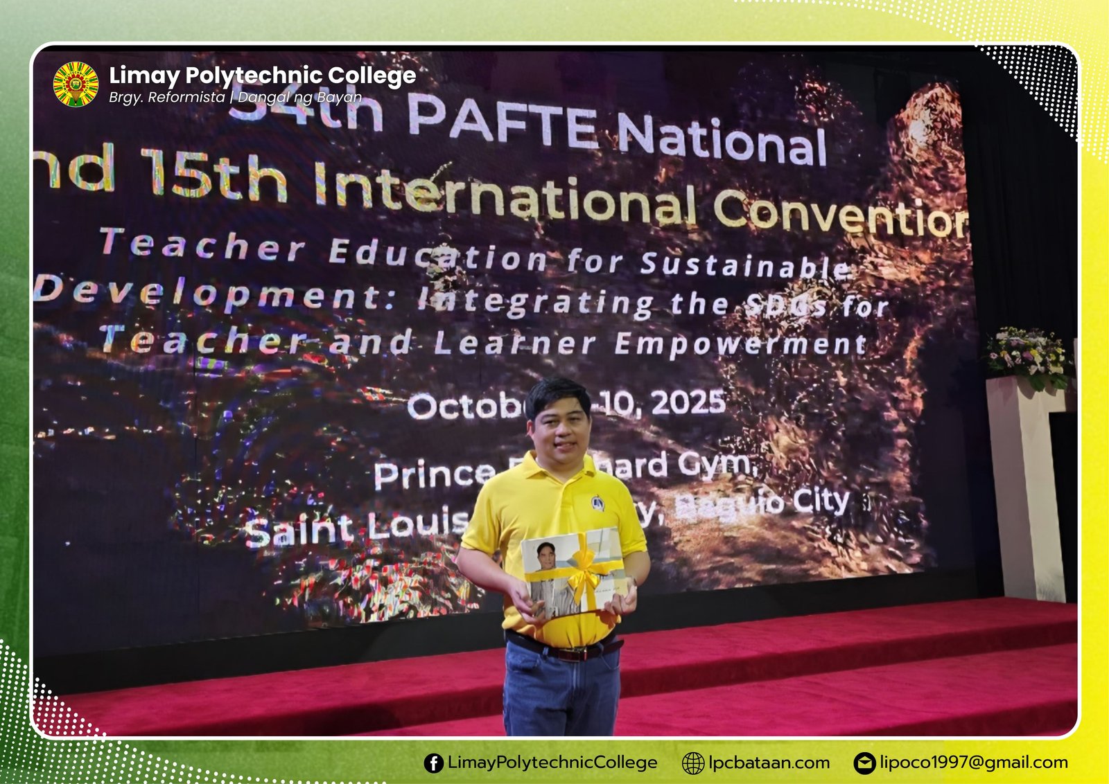 Limay Polytechnic College (LPC) President Dr. Elmer B. De Leon received a PAFTE award in grateful recognition of his remarkable achievement as president of a growing, resounding and shining local higher education institution at Saint Louis University, Baguio City during PAFTE's 54th National and 15th International Convention that capsulized Teacher Education for Sustainable Development, October 10.