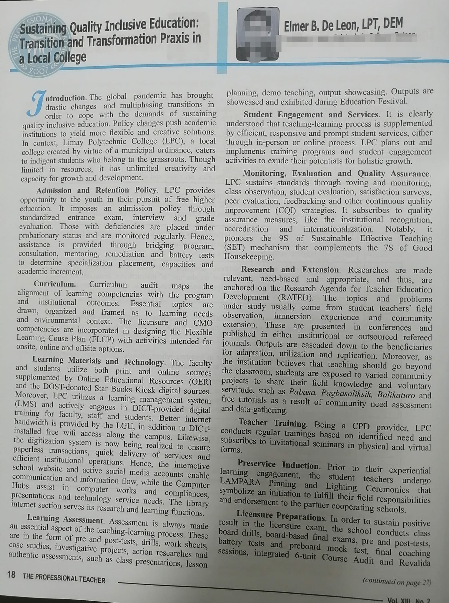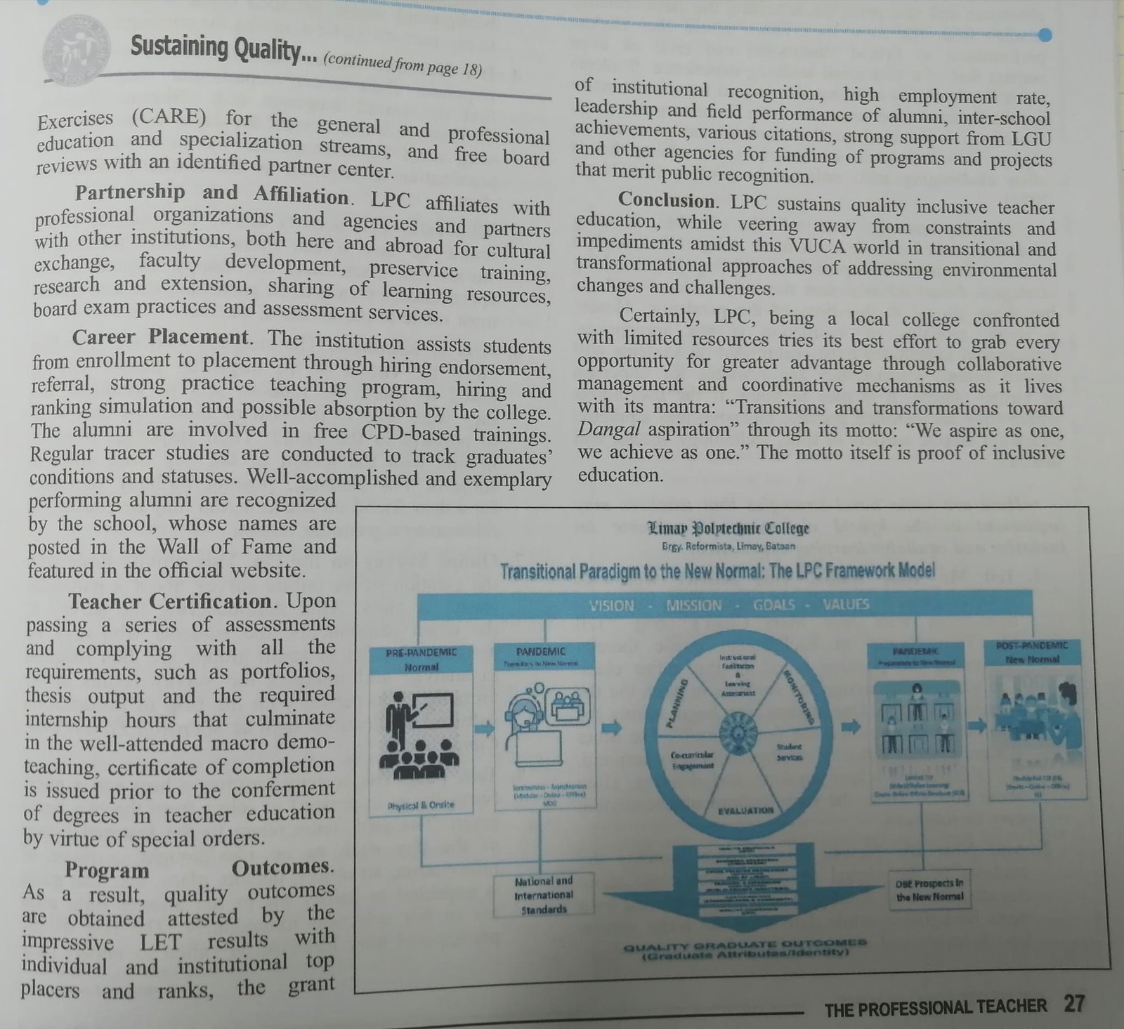 The Limay Polytechnic College’s new normal transition framework and its practices on inclusive and equitable quality education was featured and published in The Professional Teacher, a premiere magazine for teacher education circulated nationwide and abroad. The said magazine was published by Lorimar Publishing Co. This wonderful opportunity has been an inspiration to every LPCian, despite a humble and simple operation, yet its operation models, management frameworks and best practices have reached that far.