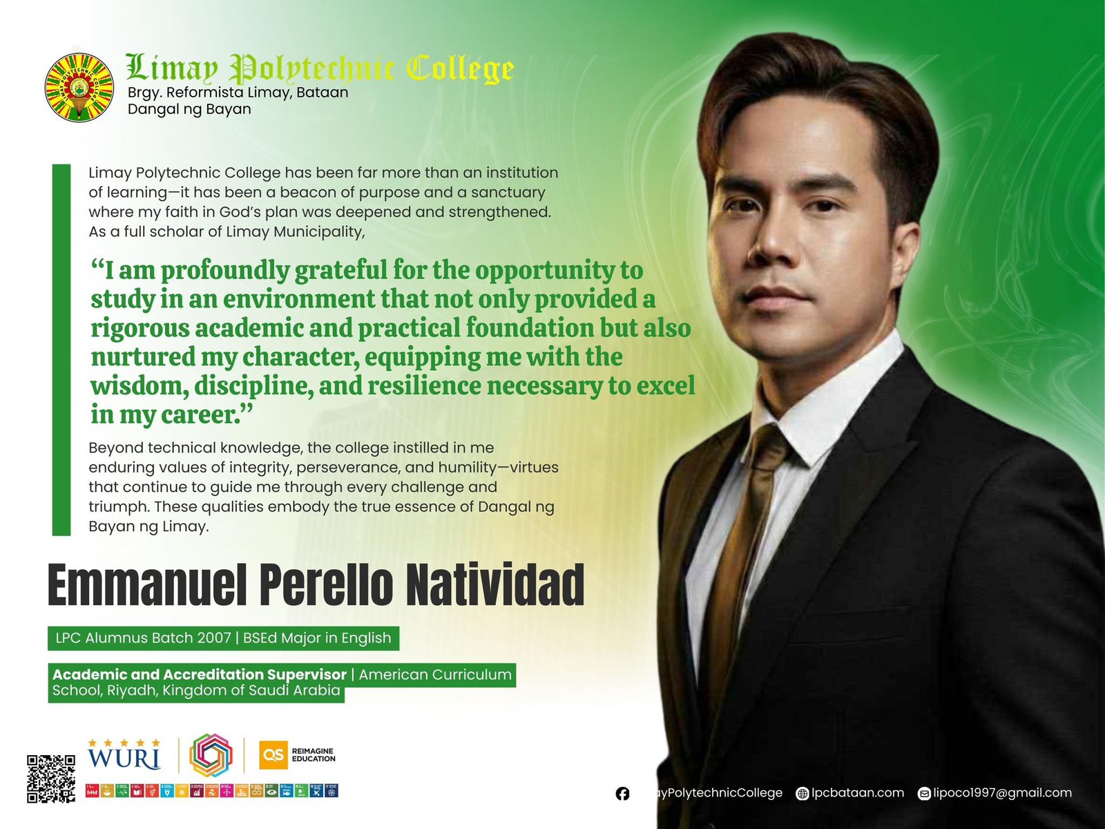 From a struggling working student surviving on fifty pesos a day to a globally recognized academic leader in the Kingdom of Saudi Arabia, Emmanuel Perello Natividad embodies the true meaning of Dangal ng Bayan ng Limay. His journey proves that faith, perseverance, and a strong foundation from Limay Polytechnic College can lead to global excellence in the international stage.