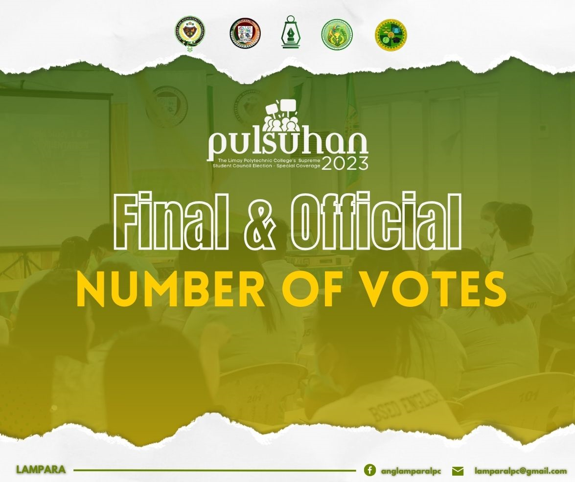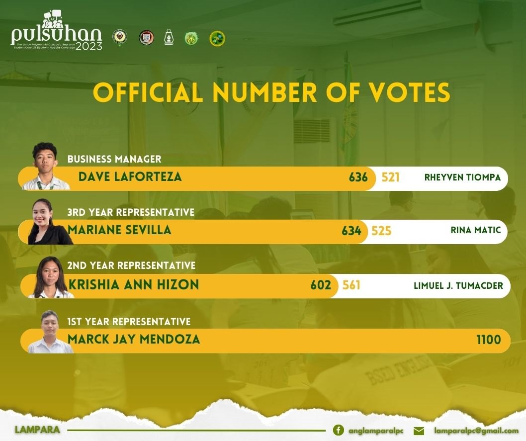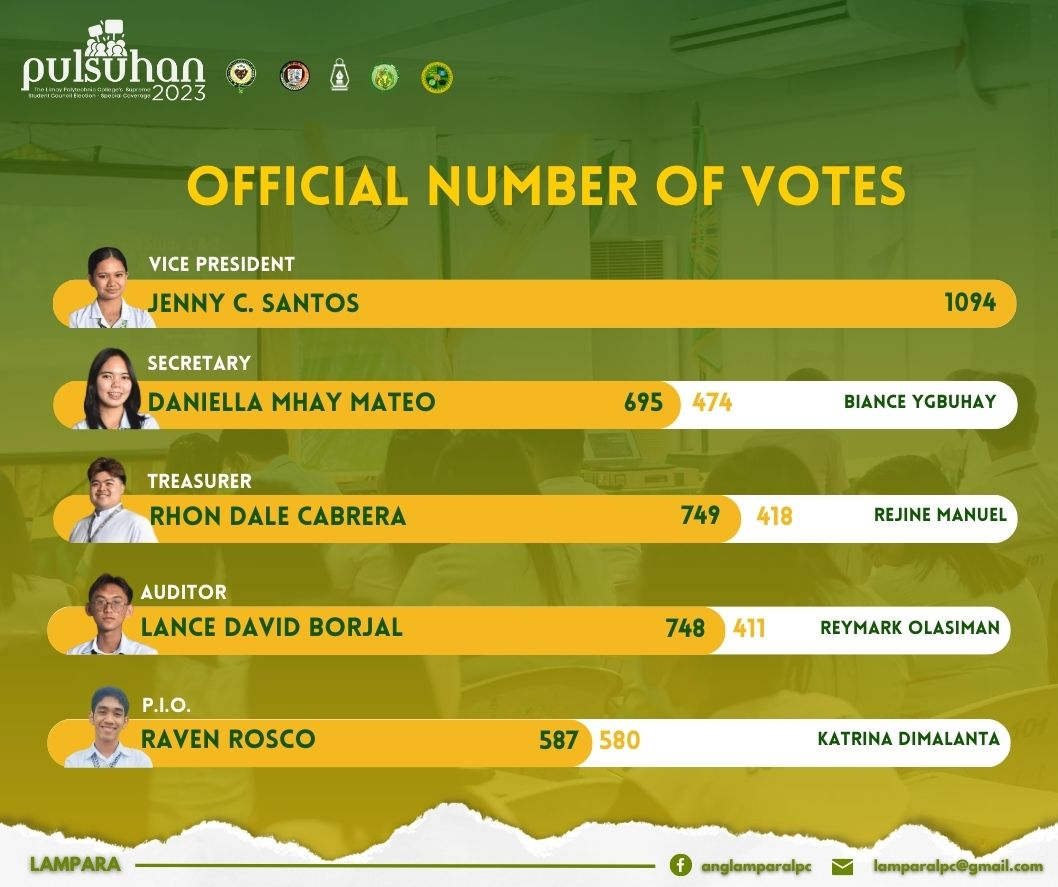 Mark Adrian Labosta from the Teacher Education Department, carrying the banner of DALISAY Party succeeded in the recently held Supreme Student Council (SSC) against vying Francis Dennis Nazareno from the B-DAY Party with 294 or 25.21% lead points in the presidency post. Labosta obtained 730 votes or 62.61%, while Nazareno had 436 or 37.39%, noting an 83.89% total votes cast by the students from the total population. Other officers who made it in the poll were: Jenny C. Santos (vice president), Daniella Mhay Mate (secretary), Rhon Dale Cabrera (treasurer), Lance David Borjal (auditor), Raven Rosco (PIO), Dave Laforteza (Business Manager), Mariane Sevilla (3rd Year Representative), Krishia Ann Hizon (2nd Year Representative), and Marck Jay Mendoza (1st Year Representative), respectively. To note, the LAMPARA Publication served as watchdog of the ongoing SSC election, ensuring fair, valid, reliable and accurate results generated from clean and peaceful election proceedings. Thus, the said publication conceptualized and plugged the “Pulsuhan 2023: The LPC-SSC Election”.