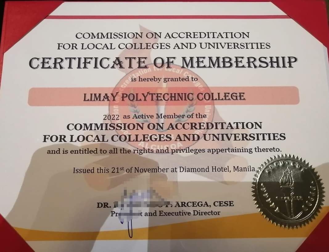 ALCUCOA conferred certificate of membership to Limay Polytechnic College at the Diamond Hotel, Manila on November 21, 2022. Hence, LPC is now a recognized ALCUCOA institutional member and thereby, is entitled to all rights and privileges appertaining thereto. This accolade is a gateway to the institution’s aspiration for quality assurance and internationalization beset with standards.