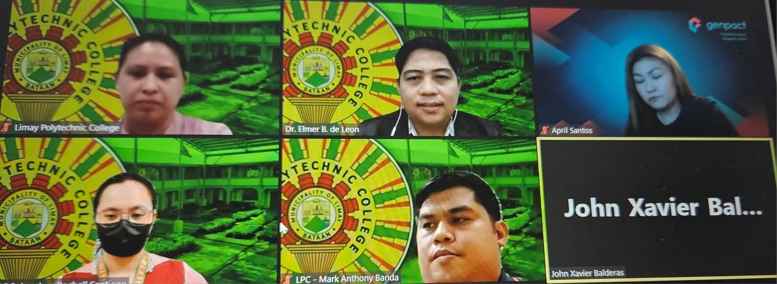 Direct from Alabang, Muntinlupa, the GenPact Phils set the second zoom meeting with Limay Polytechnic College on April 3, 2023 as a follow through of the partnership with LPC for the Associate in Computer Technology, major in Service Management Program (ACT-SM), the 'Adopt-a-School' project and possible sponsorship. Mr. John Xavier Balderas, recruitment manager and Ms. April Santos, recruitment supervisor represented the GenPact Philippines; while Dr. Elmer B. de Leon, LPC president, Ms. Frances Ann Genese, director of Academic Affairs and RDE, Ms. Ann Lou Santiago, RDE asst. and Mr. Mark Anthony B. Banda, coordinator of QUALITI were from LPC. During the meeting, the latter analyzed the result of BPO skill assessment simulation taken by Ms. Genese as a dry-run for student skill assessment intended for the ACT (Service Management) as part of the partnership. Both parties also committed for their specific roles and contributions to the said partnership to be stated in the binding Memorandum of Agreement being prepared by the college for affirmation of the second party. This is for the realization of LPC’s intent to offer the ACT-SM offering set for the S.Y. 2023-2024 with sure employment opportunities after completing and fulfilling the program.