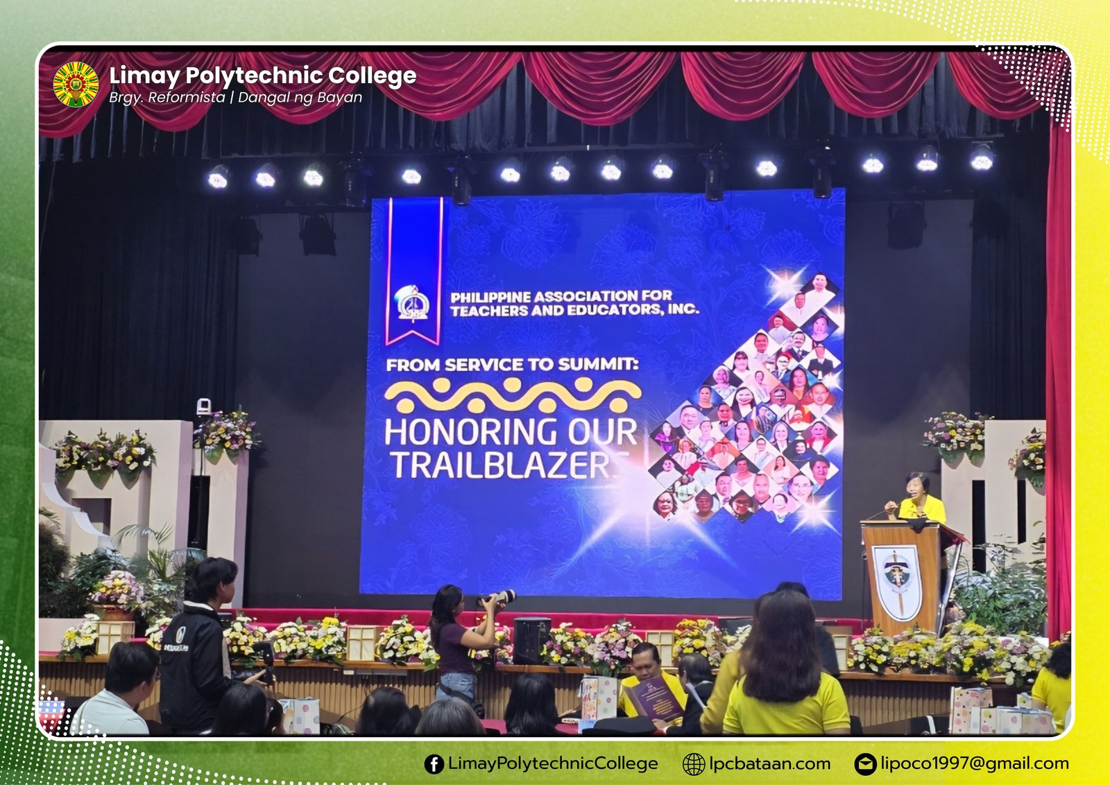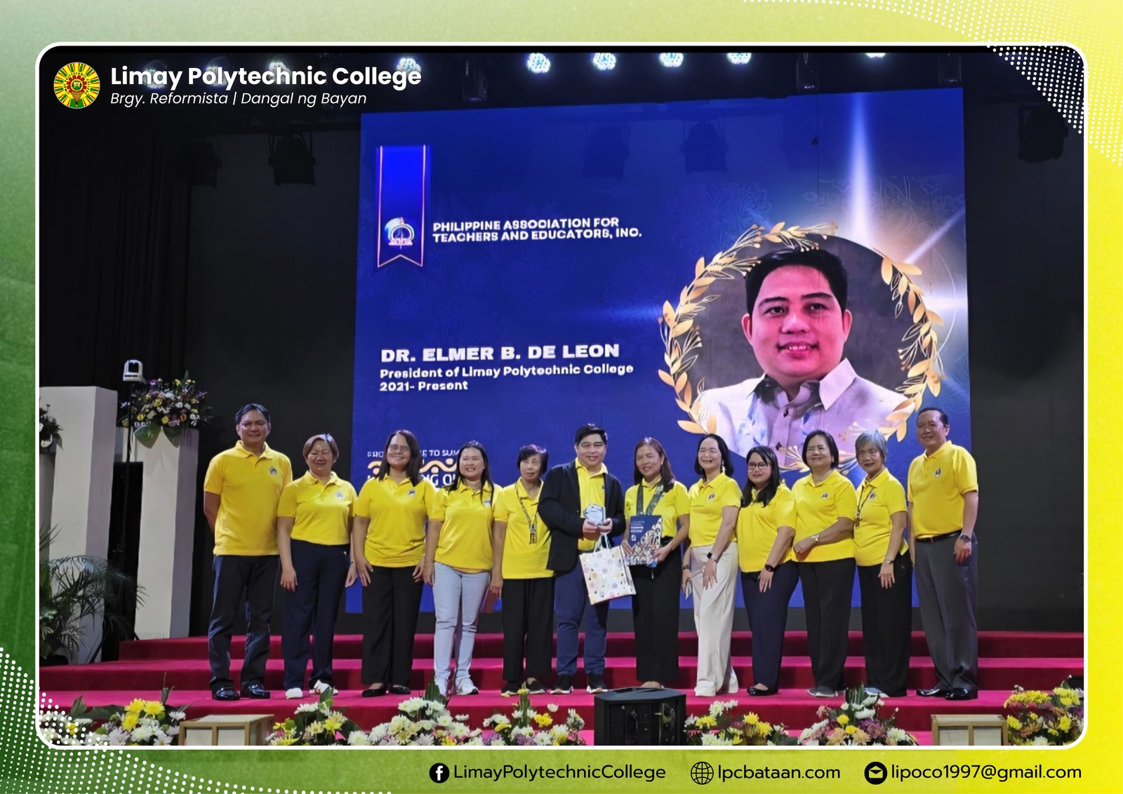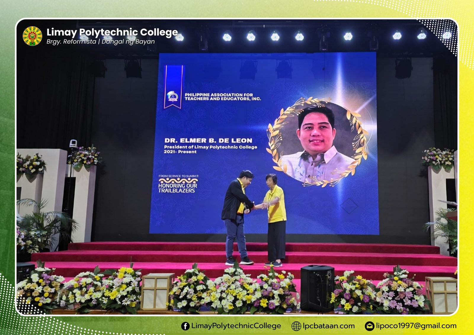 Limay Polytechnic College (LPC) President Dr. Elmer B. De Leon received a PAFTE award in grateful recognition of his remarkable achievement as president of a growing, resounding and shining local higher education institution at Saint Louis University, Baguio City during PAFTE's 54th National and 15th International Convention that capsulized Teacher Education for Sustainable Development, October 10.