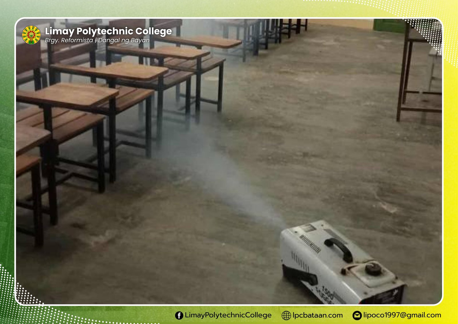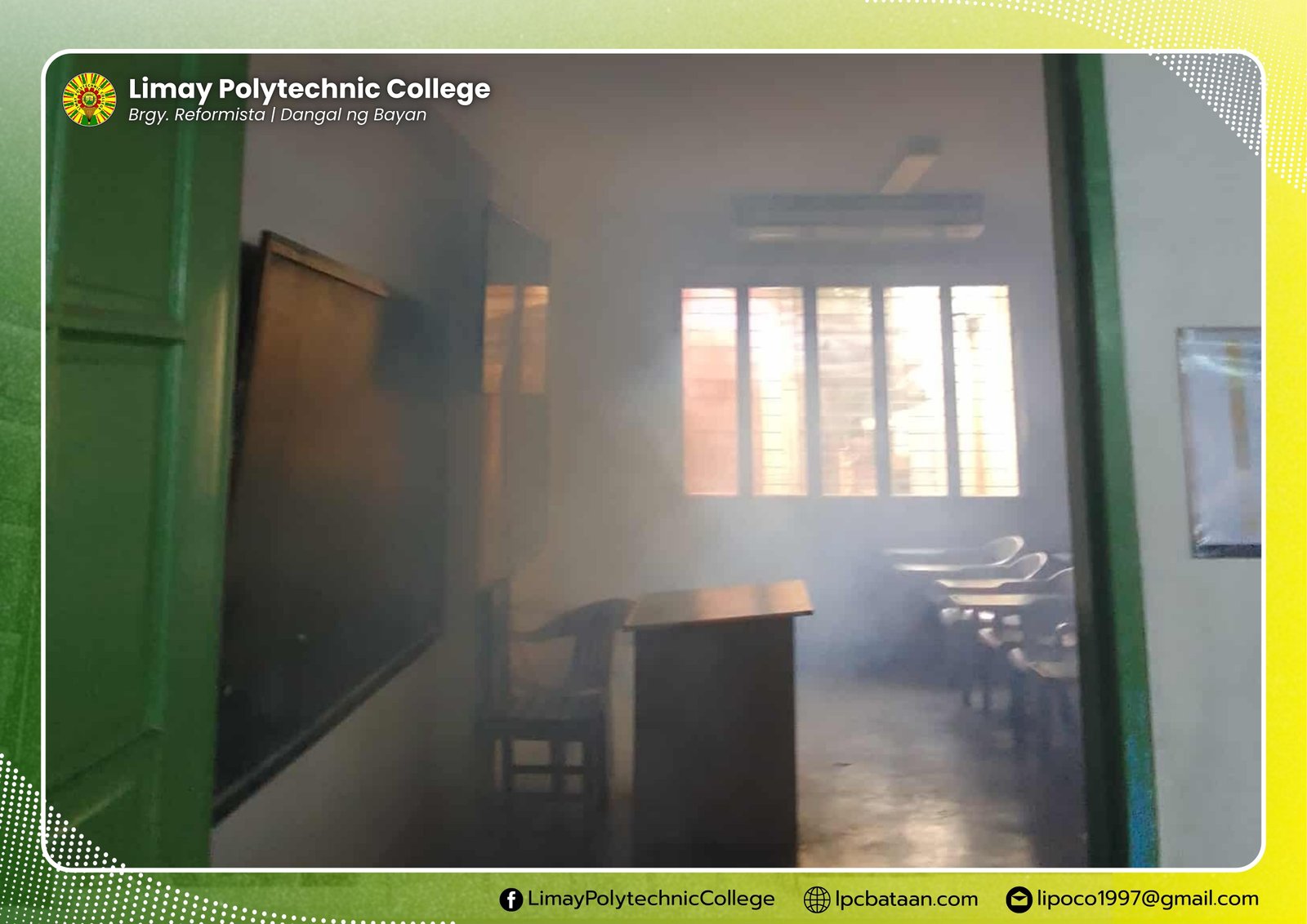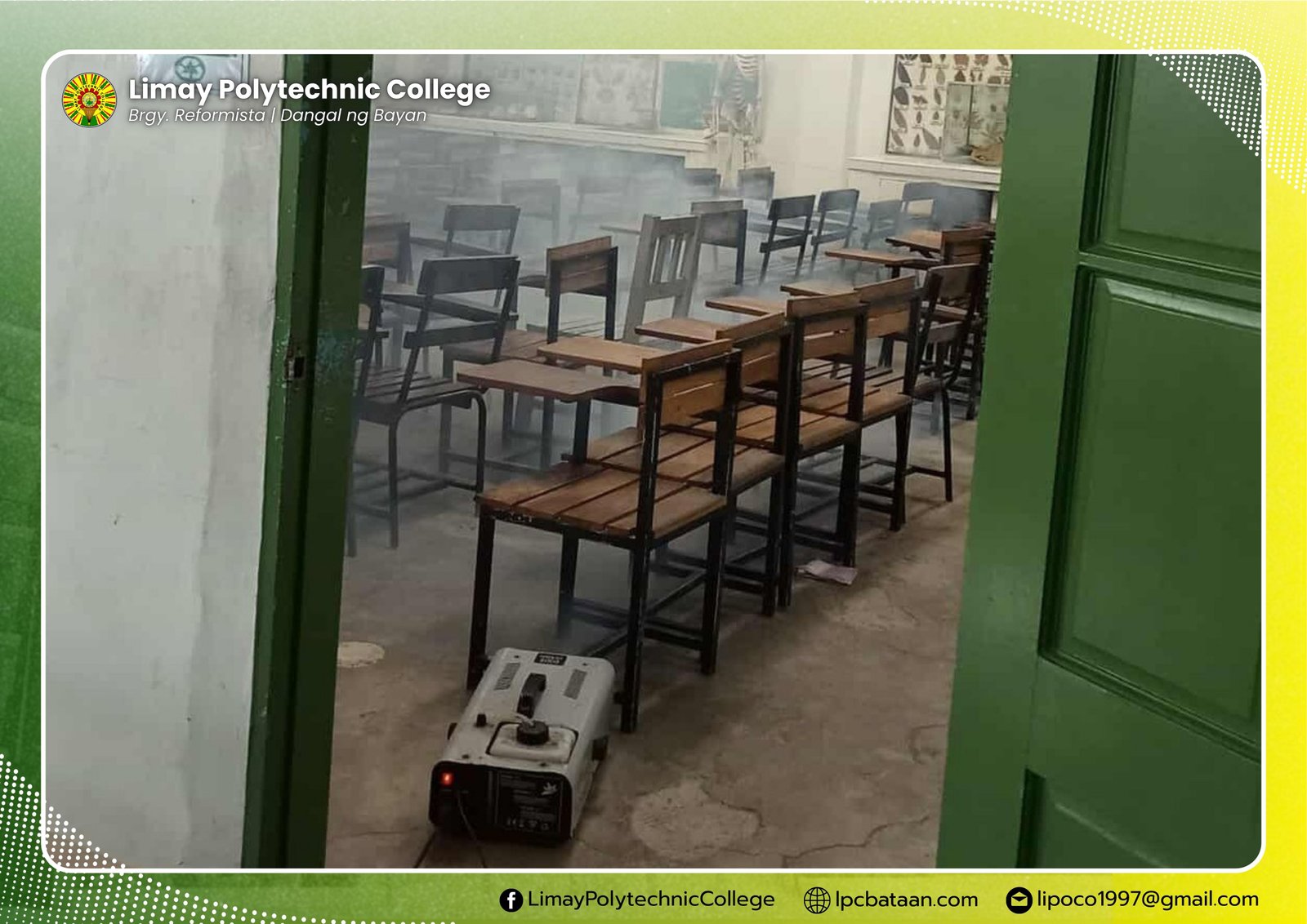 In order to prevent the wide spreading of viruses that cause flu and colds, Limay Polytechnic College (LPC), upon the request of the president, underwent fogging and disinfection in the classrooms, offices and facilities.